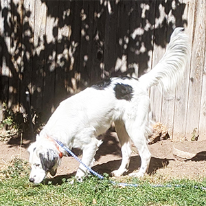 Garbo is mostly an English Setter and has a fair amount of the prey drive English Setters are known for. Those who have been around Garbo think she may be mixed with a dash of Border Collie. She may be OK with cats, but would need supervision and slow acclimation in a home with cats to make sure.