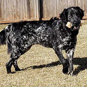 Like the youngster that he is, Johnny puts everything in his mouth–from the dog bed, to shoes, to toys. Johnny is a German Wirehaired Pointer. He is pure doggy joy.