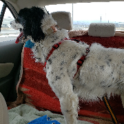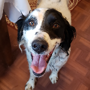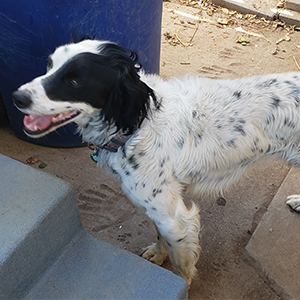 Nick is a 4 year old very handsome black and white Brittany/English Setter mix. Although he may look a lot like a Setter, he behaves a lot like a Brittany. He is very high energy and loves everyone he meets but can be a little timid with loud noises and sudden movements. He loves to climb on your lap and lick your face.