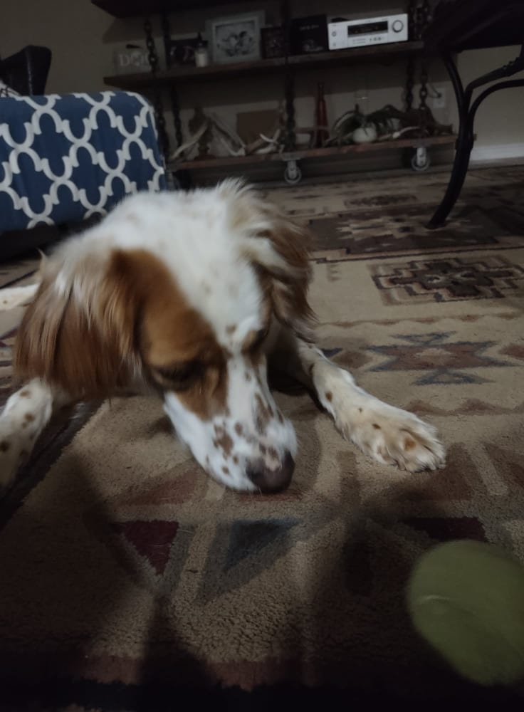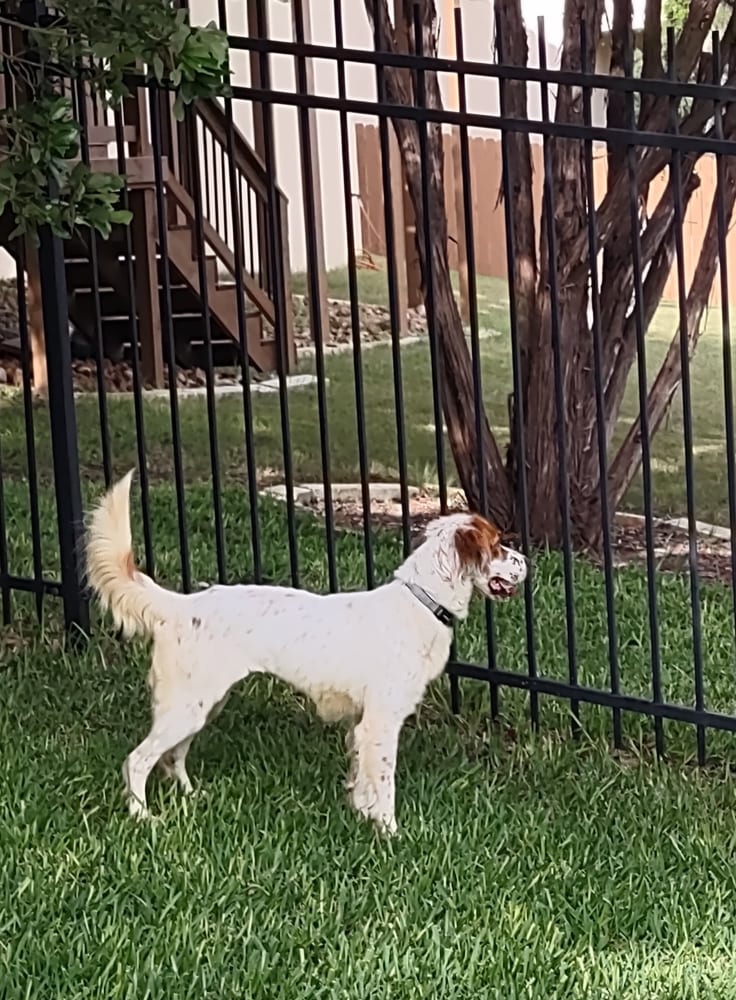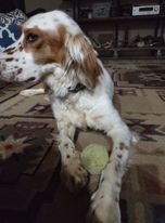 Saga gets along with the other dogs in her foster home. She loves running and chasing in a Setter-secure yard with a 6’ fence. Although she enjoys playing with tennis balls and rubber toys, her timid nature requires slow adjustment to new activities. Leash-walking is a work in progress.